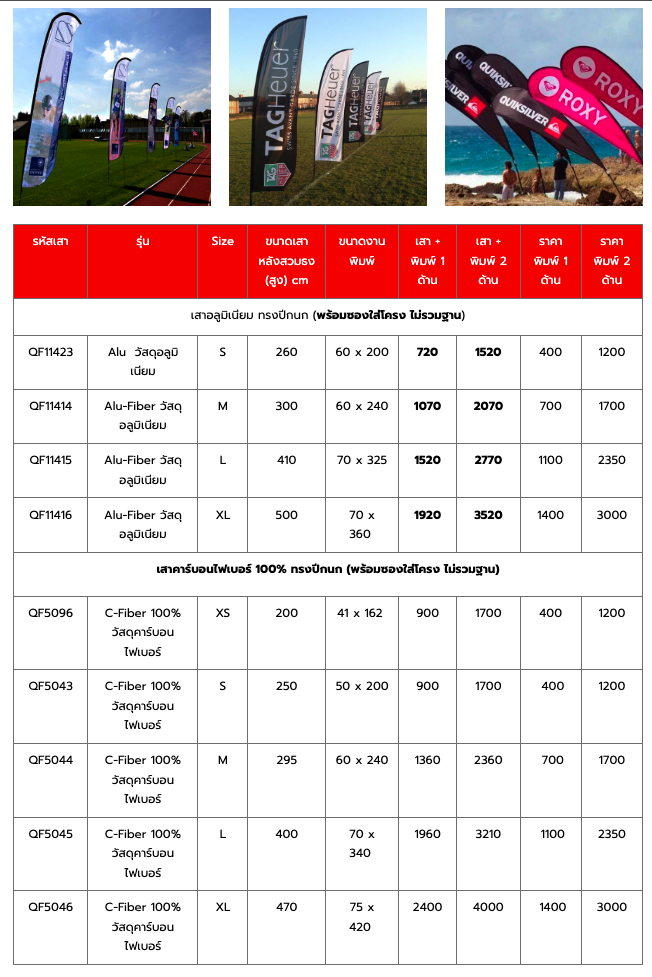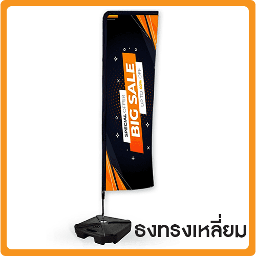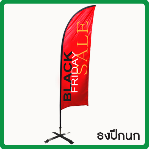 1. ธงทรงปีกนก : สามารถเลือกความสูงได้ตั้งแต่ 2 - 5 เมตร เหมาะสำหรับงานที่ต้องการความโดดเด่น ชัดเจนได้ในระยะไกล เหมาะสำหรับร้านค้าริมถนนใหญ่หรืองานอีเว้นต์ที่มีพื้นที่กว้างขวางขนาดใหญ่