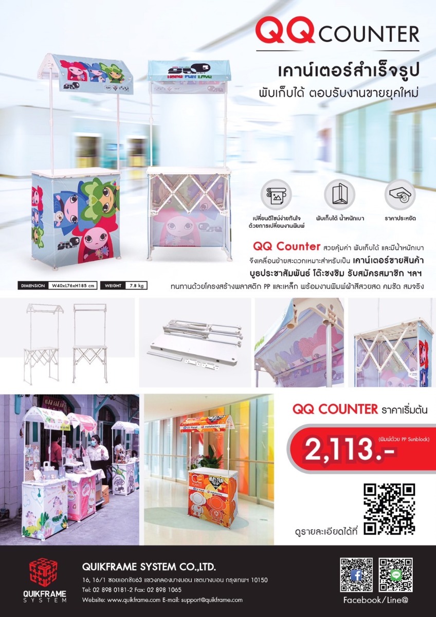 โดยเรามีทีมพัฒนาผลิตภัณฑ์และออกแบบ อุปกรณ์ออกบูธ ที่เป็นมืออาชีพอย่าง QUIKFRAME ที่พัฒนาและผลิต QQ Counter ที่มีจุดเด่นเรื่องความแข็งแรง ทนทาน ใช้งานง่าย นอกจากนั้นยังมีความพิเศษและข้อดีอื่นๆ เช่น