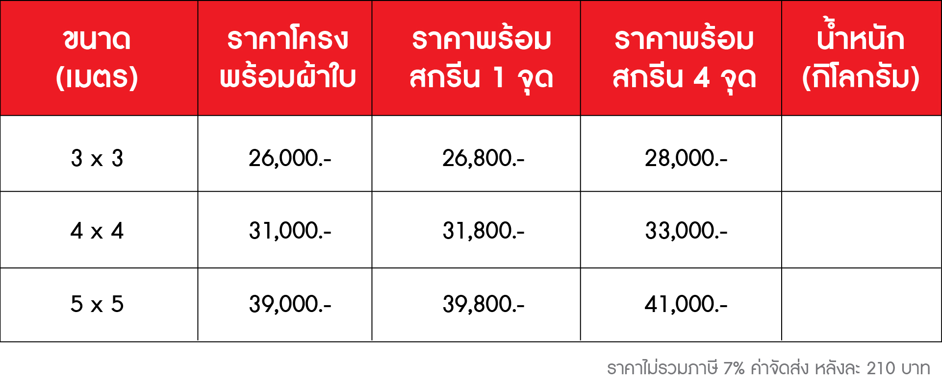 **อุปกรณ์เสริมประกอบด้วย ถุงน้ำเพิ่มน้ำหนัก, สมอดิน, ผ้ารองพื้น, เครื่องปั๊มลมไฟฟ้า